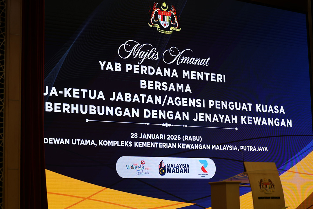 PUTRAJAYA, 28 January 2026 – The National Anti-Financial Crime Centre (NFCC), as the organizer, convened the Address by the Right Honourable Prime Minister to Heads of Departments and Law Enforcement Agencies Related to Financial Crimes at the Main Hall, Ministry of Finance Complex, Putrajaya. The event featured an address by the Right Honourable Dato’ Seri Anwar bin Ibrahim, Prime Minister of Malaysia, and was also attended by YB Datuk Seri Saifuddin Nasution bin Ismail, Minister of Home Affairs; YBhg. Tan Sri Shamsul Azri bin Abu Bakar, Chief Secretary to the Government; YBhg. Tan Sri Dato’ Sri Haji Azam bin Baki, Chief Commissioner of the Malaysian Anti-Corruption Commission; as well as Directors General and heads of enforcement agencies.