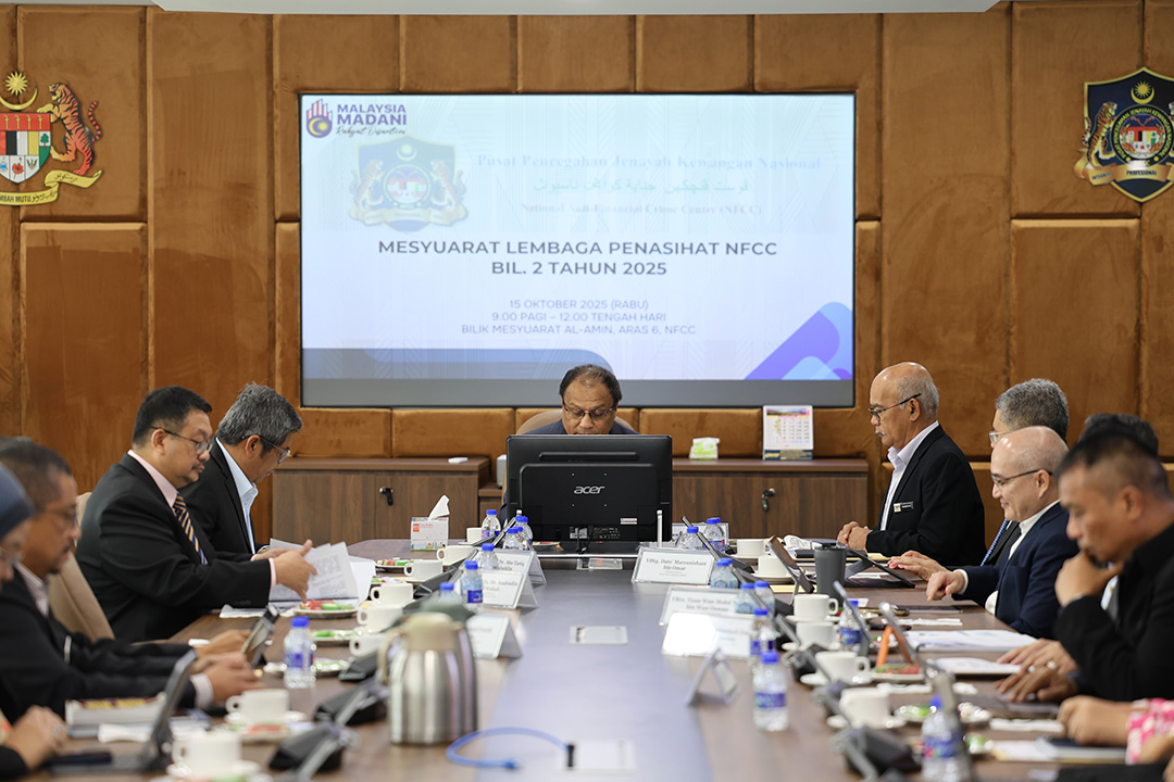 PUTRAJAYA, 15 October 2025 – YBhg. Tan Sri Mohd Dusuki bin Mokhtar, the Attorney General, chaired the NFCC Advisory Board Meeting 2/2025 held at the NFCC headquarters in Putrajaya. The meeting was attended by members of the Advisory Board, namely YBhg. Dato’ Sri Shamshun Baharin bin Mohd Jamil, Director General of NFCC; YBhg. Tan Sri Dato’ Sri Azam bin Baki, Chief Commissioner of MACC, YBhg. Datuk Abu Tariq bin Jamaludin, Chief Executive Officer of LHDNM, YBhg. Dato’ Ts. Dr. Amirudin bin Abdul Wahab, Chief Executive Officer of CSM, and YBhg. Dato’ Marzunisham bin Omar, Deputy Governor of Bank Negara Malaysia (BNM).