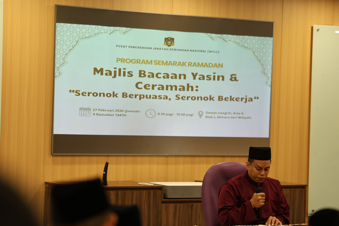 PUTRAJAYA, 27 Februari 2026 - Pusat Pencegahan Jenayah Kewangan Nasional (NFCC) telah menganjurkan program Semarak Ramadhan: Bacaan Yaasin & Ceramah “Seronok Berpuasa, Seronok Bekerja” yang telah dihadiri oleh warga NFCC dan juga turut serta warga Majlis Sukan Wilayah Persekutuan (MSWP), Jabatan Wilayah Persekutuan (JWP), dan Unit Jawatankuasa Kerja Tanah Wilayah Persekutuan (UJKT) bagi mengimarahkan majlis. Majlis ini juga dilengkapkan dengan ceramah “Seronok Berpuasa, Seronok Bekerja” yang telah disampaikan oleh Ustaz Haji Hasli bin Othman, Penolong Pengarah Kanan Bahagian Dakwah, Jabatan Kemajuan Islam Malaysia (JAKIM).